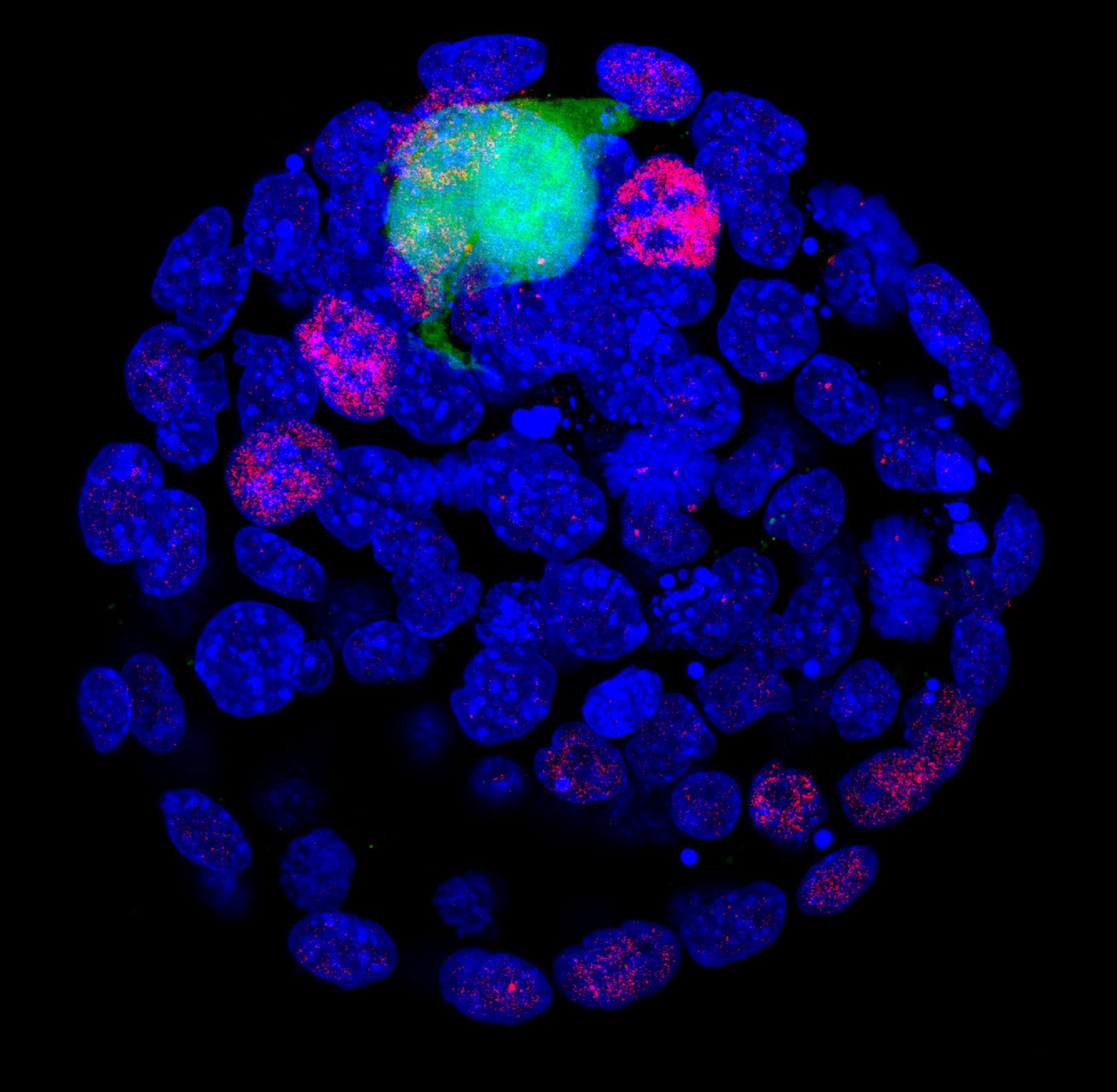 Células madres pluripotentes (verde) en el epiblasto (rojo) de un embrión de ratón en día 3,5 de gestación (azul). Fuente: UGR.
