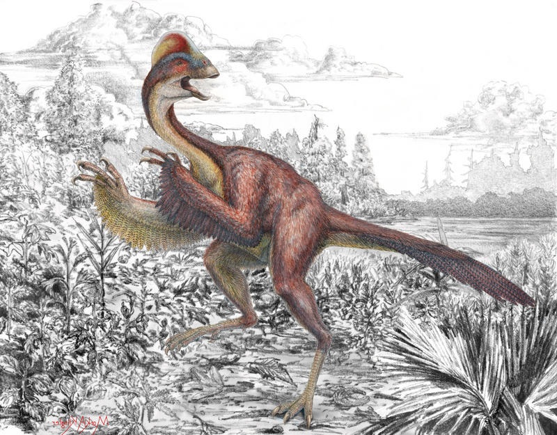 Sues apunta: “Es de la familia de los caenagnathidae y parece un cruce entre un ave no voladora y un reptil. Tenían pico, pero no dientes, una cresta sobre su cabeza, brazos largos, manos con grandes garras y en forma de hoz, y sus piernas traseras también eran largas como su cola, que terminaba en un pequeño abanico de plumas”.