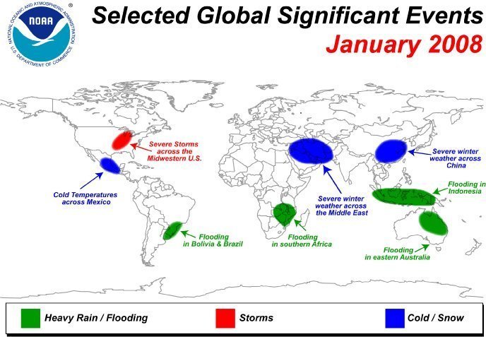 También fue el mes de enero más frío globalmente desde 1989, y además un 0,75º C más frío que enero de 2007. Enero 2008 fue también 0,39ºC más frío que enero 1998. El NCDC muestra a enero 2008 como el enero más frío de la superficie desde el mismo mes de 1982.