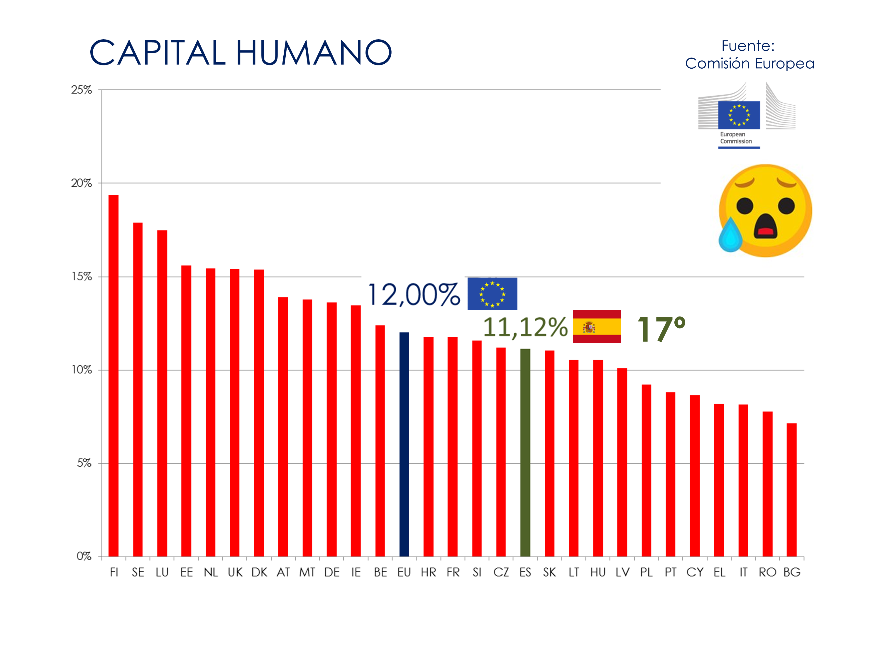 En la dimensión del “capital humano” se mide las habilidades necesarias para aprovechar las posibilidades que ofrece la tecnología digital. Los primeros puestos están ocupados por Finlandia, Suecia, Luxemburgo, Estonia, Países Bajos, Reino Unido, Dinamarca, Austria, Malta y Alemania. España apenas escapa de los últimos puestos, ocupados por Lituana, Hungría, LV, Polonia, Portugal, Chipre, Grecia, Italia, Rumanía y Bulgaria. España ocupa el puesto 17 en capital humano de la Unión Europea, su puesto más desfavorecido.