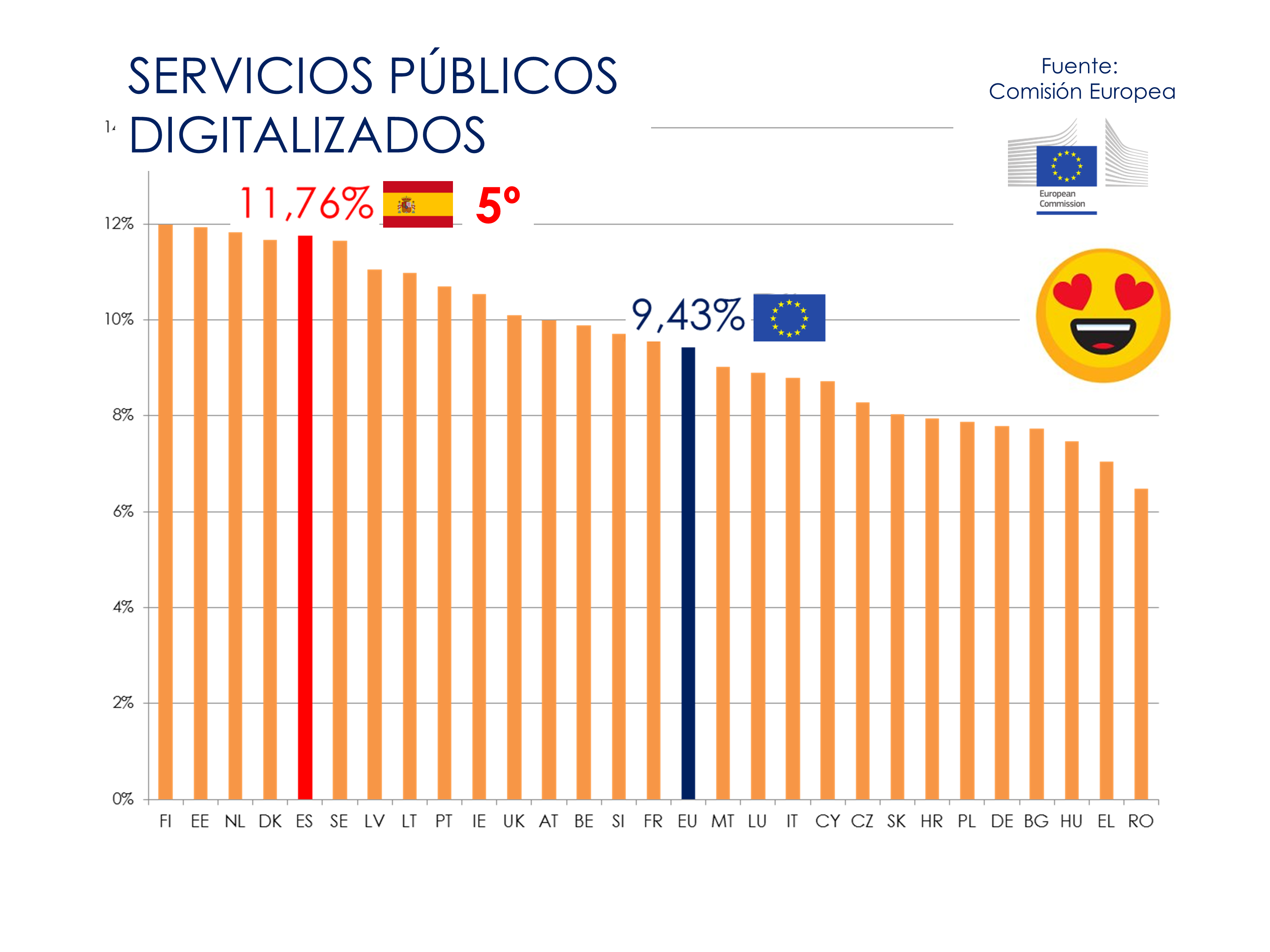 La Comisión Europea destaca a España entre los primeros cinco puestos en servicios públicos digitales. Finlandia tiene la puntuación más alta, seguida de Estonia, los Países Bajos, Dinamarca y España. Rumanía, Grecia y Hungría tienen las puntuaciones más bajas.