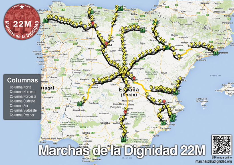 Las diferentes columnas convergerán en Madrid el 22 de marzo para luchar por un empleo digno, por la renta básica, por los derechos sociales, y por las libertades económicas; y se opondrán a los recortes, la represión y la corrupción.