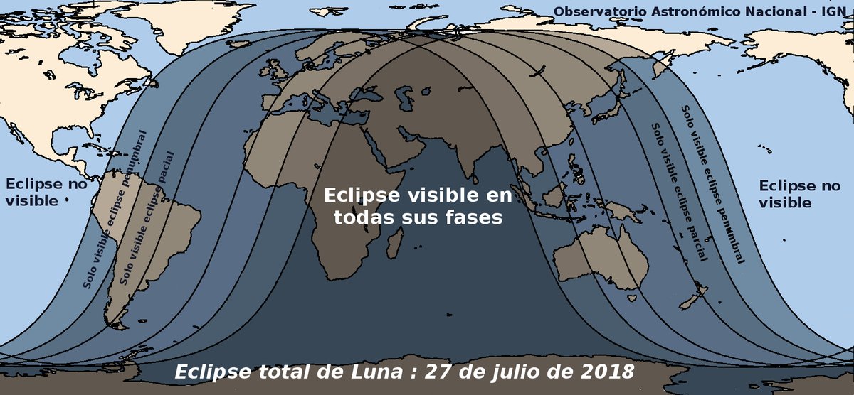 El eclipse lunar de esta noche se producirá con el máximo centrado en el Océano Índico, según datos proporcionados por la NASA. La fase de totalidad del Eclipse durará 1 hora y 42 minutos -el más largo del siglo XXI- comenzado a las 19:30 horas UT (dos horas más en la Europa continental) y finalizando a las 21:13 horas UT.