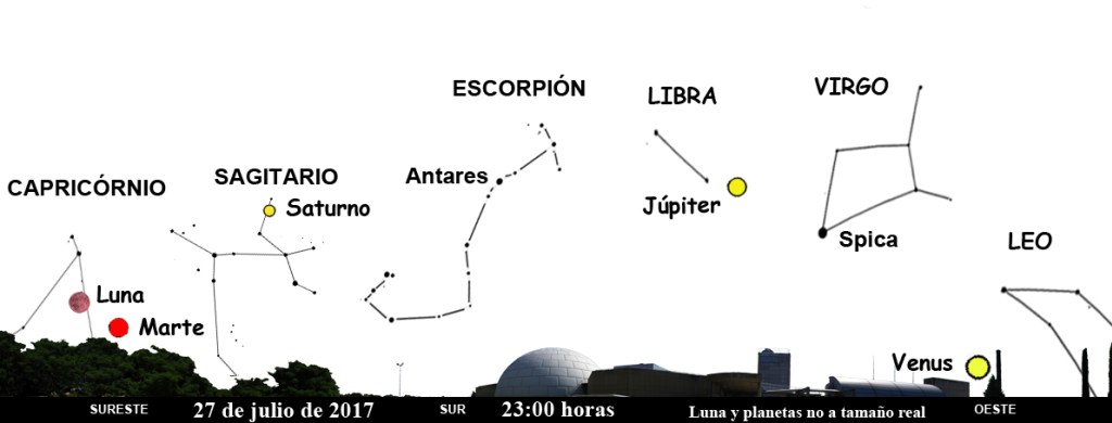 La misma noche que se produce el eclipse total de Luna, y no muy lejos de ella en el horizonte, se podrá observar a Marte llegando a su oposición. Esto significa que el planeta rojo y el Sol se sitúan en lados opuestos respecto a la Tierra, quedando los tres objetos perfectamente alineados.