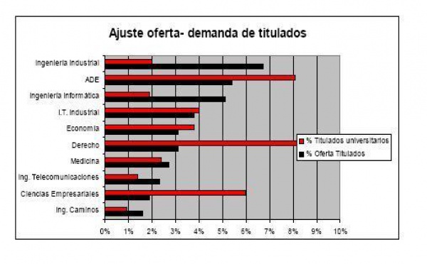 Los titulados universitarios lideran la oferta de empleo cualificado en España, que ha crecido casi 3 puntos porcentuales respecto a 2010. Las ofertas de empleo que requieren titulados técnicos también crecen, cambiando la tendencia de los dos últimos años. Ingeniería Industrial es la carrera más demandada por las empresas, seguida de Administración y Dirección de Empresas, Informática, Ingeniería Técnica Industrial, Economía, Derecho y Medicina. Cinco carreras presentan déficit de titulados para cubrir las ofertas de empleo: las Ingenierías de Industriales, Informática, Telecomunicaciones y Caminos, además de Medicina