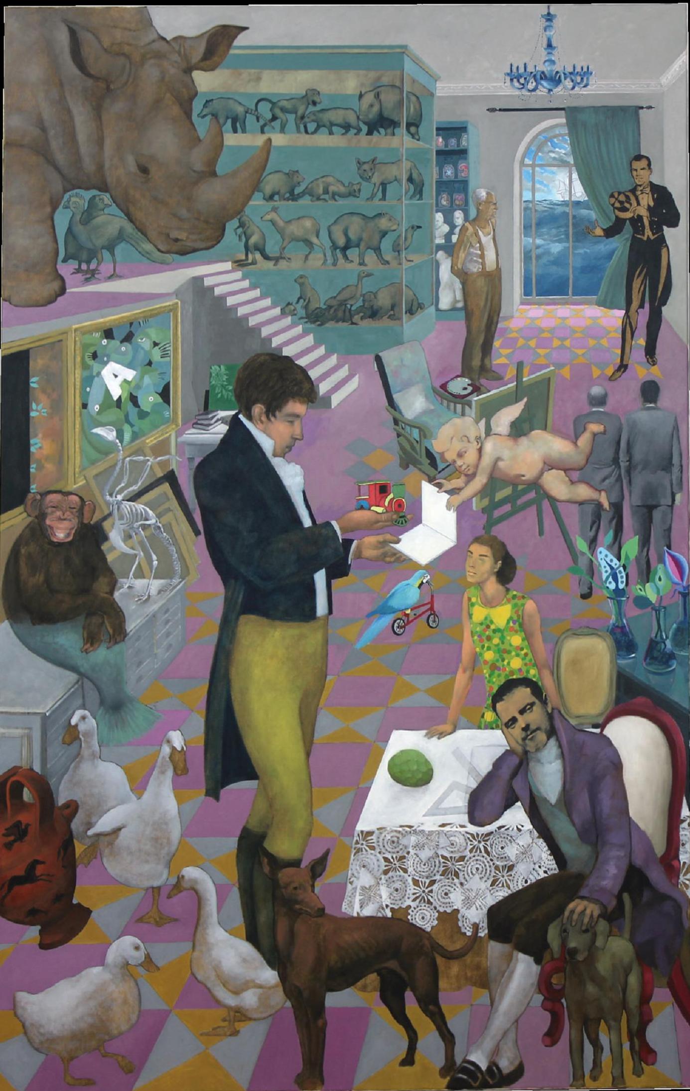 Tampoco falta un guiño literario y socarrón. En el cuadro, junto a un gran rinoceronte, toman forma los animales tal y como aparecen en la clasificación de esa “cierta enciclopedia china” –Emporio celestial de conocimientos benévolos– citada por Borges en su texto “El idioma analítico de John Wilkins”.