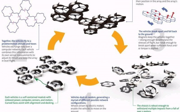 Ingenieros del Instituto Federal Suizo de Tecnología han creado una plataforma voladora ensamblando vehículos en miniatura, autónomos e “inteligentes”. Para poder volar, estos vehículos se acoplan entre sí por atracción magnética y se comunican unos con otros, mediante sensores, con el fin de mantener el nivel de vuelo.