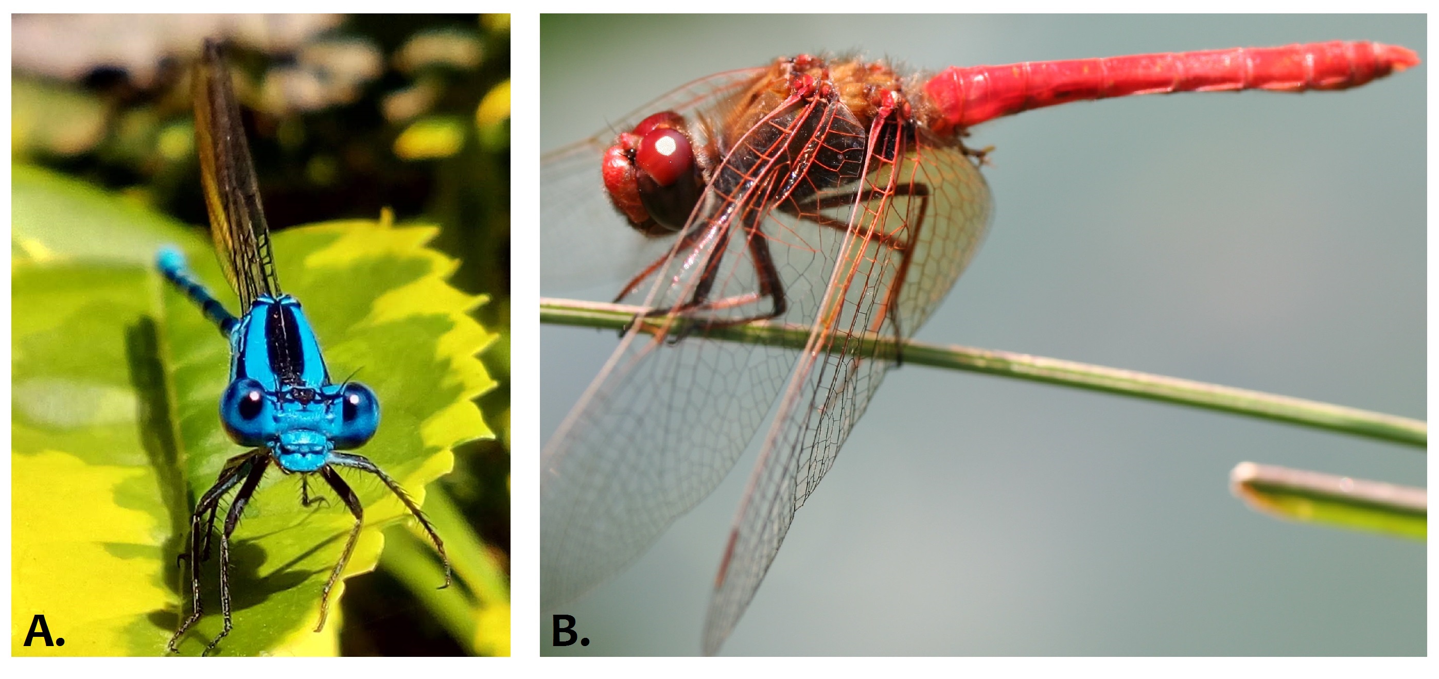 Figura 1. Representantes del orden Odonata. A. Caballito del diablo (suborden Zygoptera). B. Libélula (suborden Anisoptera). Fotos: Catalina Suárez Tovar.