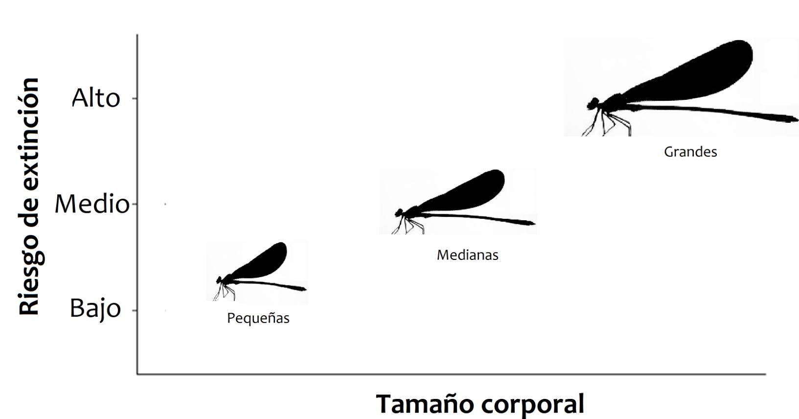 Figura 2. Relación entre riesgo de extinción y tamaño corporal encontrada en especies de caballitos del diablo.
