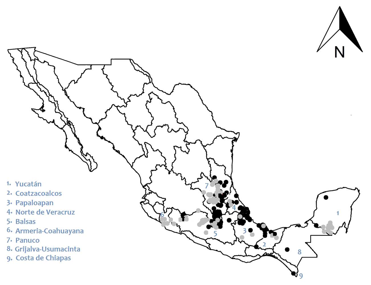 Figura 4. Sitios en México donde se encontraron comunidades de libélulas y caballitos del diablo en los dos periodos estudiados: 1980-1993 (puntos negros) y 1994-2010 (puntos grises). Imagen modificada de Rocha-Ortega et al. 2019.