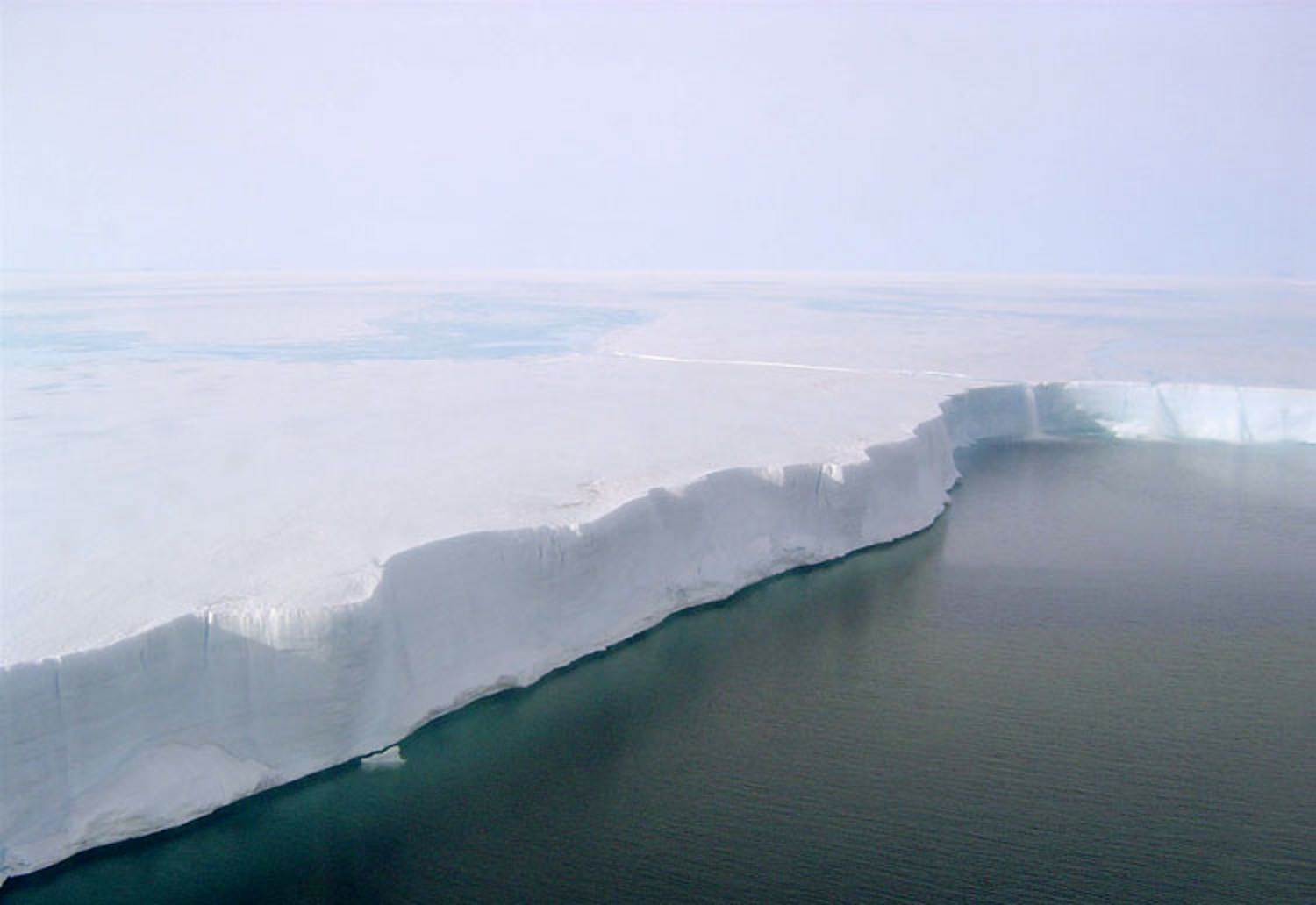 Borde de la plataforma de hielo Larsen B. El derretimiento de la superficie es visible y fluye por el borde como una cascada. Una nueva investigación proyecta una duplicación del deshielo de la superficie de las plataformas de la Antártida en 2050.. Fuente: Ted Scambos & Rob Bauer, NSIDC.