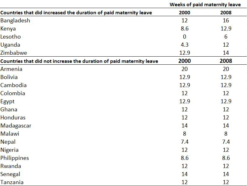 Arijit Nandi, Mohammad Hajizadeh, Sam Harper, Alissa Koski, Erin C. Strumpf, Jody Heymann: Increased Duration of Paid Maternity Leave Lowers Infant Mortality in Low- and Middle-Income Countries: A Quasi-Experimental Study. PLOS Medicine (2016). DOI: 10.1371/journal.pmed.1001985.