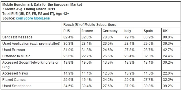 Durante el pasado mes de marzo de 2011, 20 millones de usuarios de móviles de los cinco principales mercados europeos (Reino Unido, Francia, España, Alemania e Italia) accedieron a su cuenta bancaria a través del móvil, según el último informe de comScore MobiLens, líder en medición en el mundo digital. Estos 20 millones de personas suponen el 8,5% del total de usuarios de móviles en estos cinco mercados europeos.