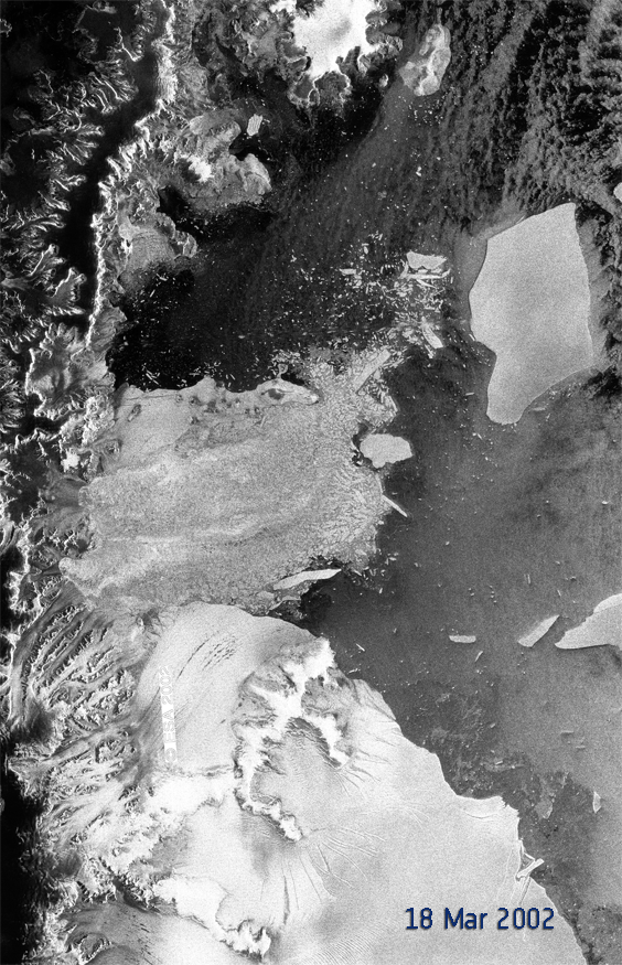 La extensión de la barrera Larsen B pasó de 11.512 kilómetros cuadrados en enero de 1995 a 6 664 en febrero de 2002, tras una larga serie de desprendimientos. Tras el colapso de marzo de 2002, su extensión se redujo a 3 463. A día de hoy, Envisat muestra que Larsen B cuenta con una superficie de tan sólo 1.670 kilómetros cuadrados.