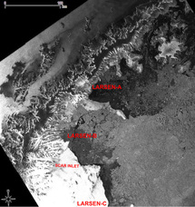 Larsen A se desintegró en enero de 1995. Larsen C había mantenido una extensión más o menos estable, pero las medidas realizadas con la ayuda de los satélites desvelan que está perdiendo espesor y que la duración del deshielo estival no ha dejado de aumentar.