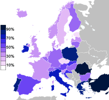 Porcentajes de creencia en Dios en Europa, a partir de datos del Eurobarómetro (2005). Fuente: Wikipedia.
