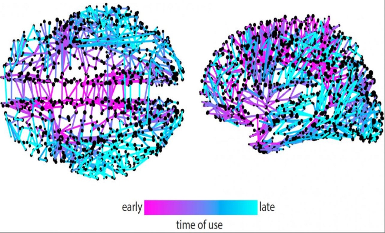 Esta imagen representa los momentos en que diferentes conexiones cerebrales se activan para difundir información. En general, la información parece propagarse rápidamente a partir de un núcleo compacto de vías centrales. Imagen: Olaf Sporns y Bratislav Misic. Fuente: IU.