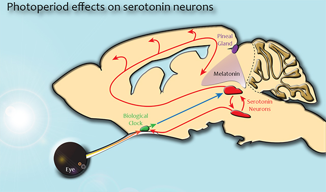Noah H. Green, Chad R. Jackson, Hideki Iwamoto, Michael C. Tackenberg, Douglas G. McMahon: Photoperiod Programs Dorsal Raphe Serotonergic Neurons and Affective Behaviors. Current Biology (2015). DOI: 10.1016/j.cub.2015.03.050.
