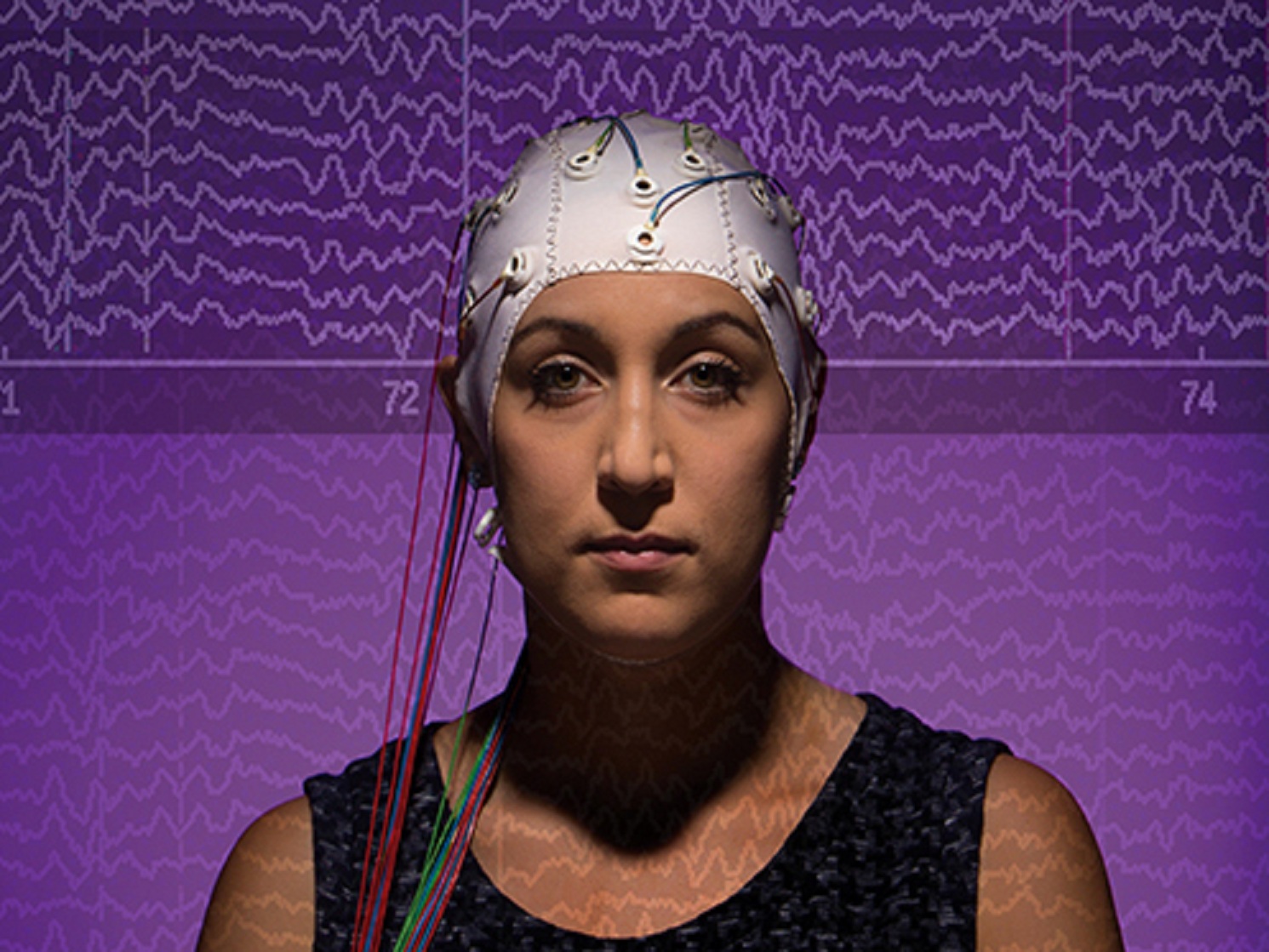 La estudiante Jenilyn Brhel, con la gorra de medición. Sus ondas están de fondo. Imagen: Jonathan Cohen. Fuente: Universidad Binghamton.