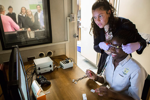 La investigadora Mavi Ruiz-Blondet mide las ondas cerebrales de una alumna de la universidad. Fuente: Universidad Binghamton.