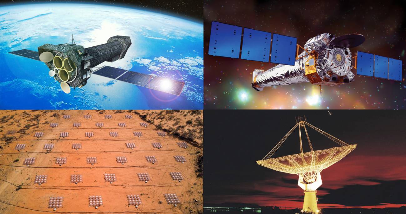 Observatorio de rayos X Chandra de la NASA, el telescopio espacial XMM-Newton de la ESA, el Murchison Widefield Array (MWA) en Australia occidental y el radiotelescopio gigante de Metrewave (GMRT) en India. (Fotomontaje: SINC)