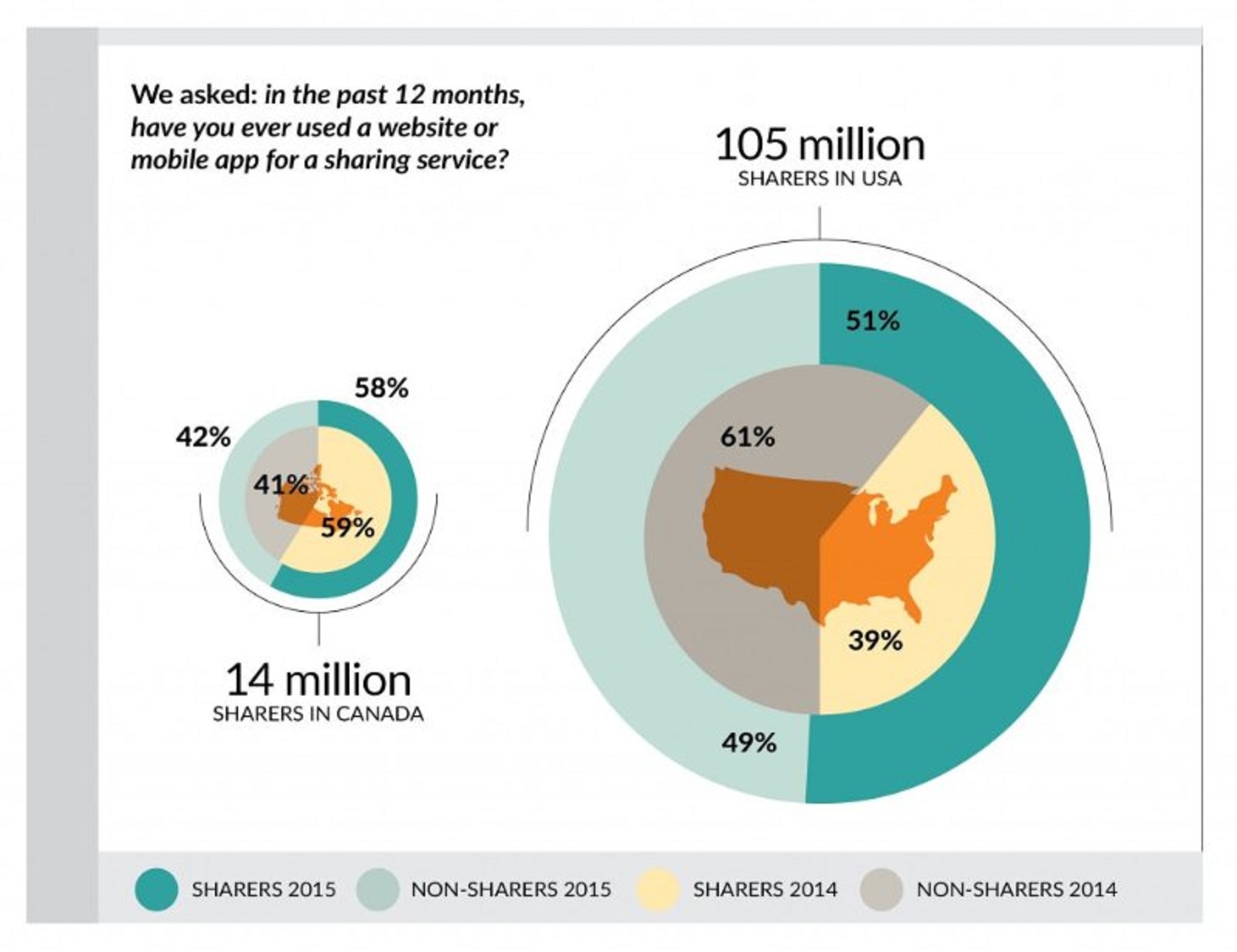 Según el estudio, más de 110 millones de norteamericanos (estadounidenses y canadienses) estarían participando actualmente en este tipo de economía, y más de la mitad de ellos obtendrían ya productos y servicios en tratos de igual a igual (peer to peer), en lugar de adquirirlos en empresas establecidas.