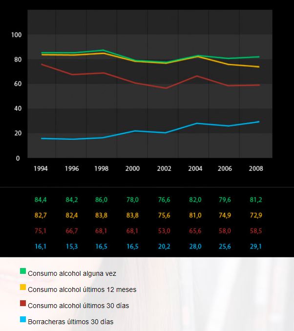 A pesar de las regulaciones, en España se ha disparado el consumo de alcohol entre los jóvenes. Según los datos del Ministerio de Sanidad, Política Social e Igualdad, el consumo de alcohol suele iniciarse alrededor de los 13 años. La última Encuesta sobre uso de drogas en enseñanzas secundarias en España (ESTUDES) de 2016 señala que más del 75 por ciento de los jóvenes consume alcohol.