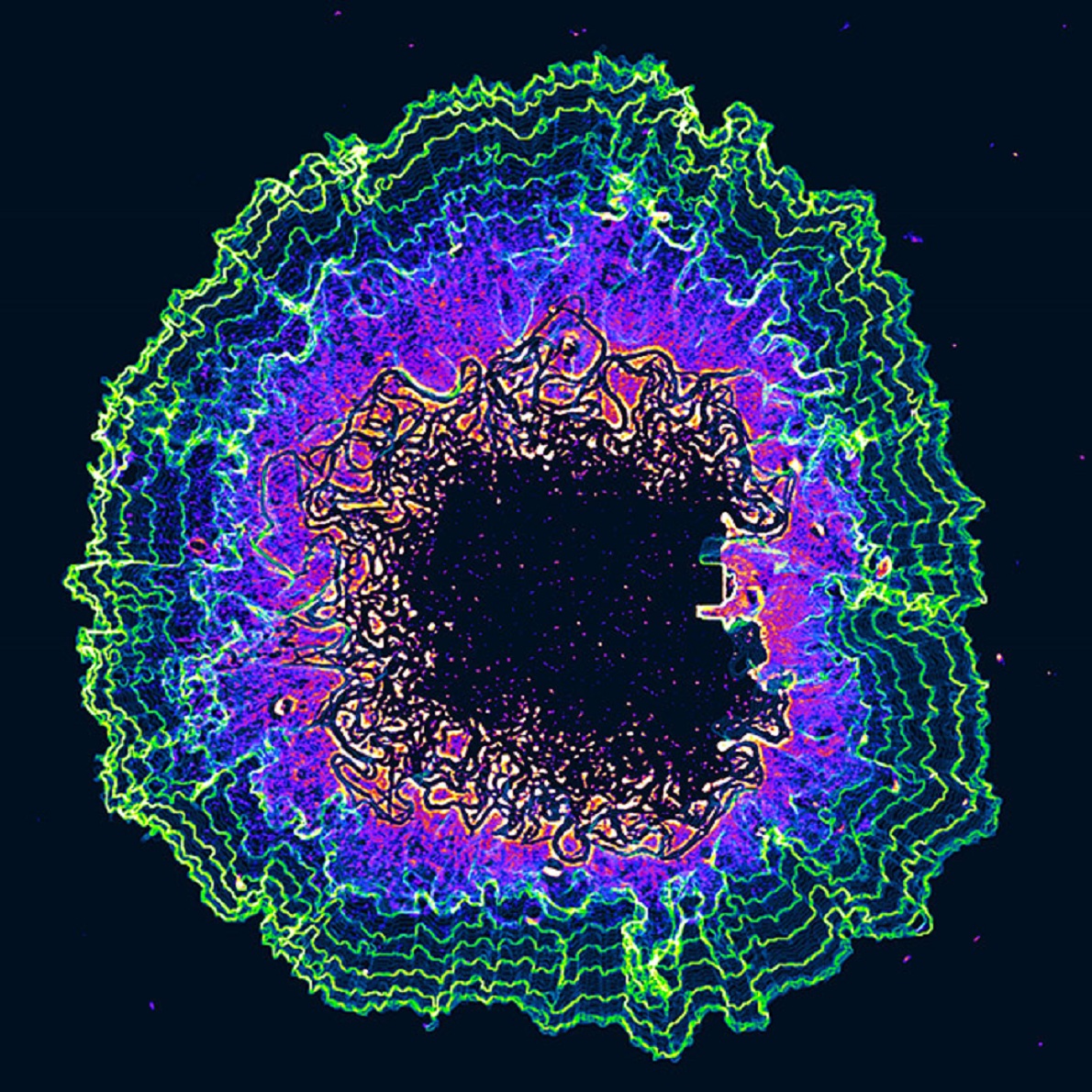 Una biopelícula de bacterias, con los bordes oscilantes (las líneas del contorno). Imagen: Laboratorio de Suel. Fuente: UC San Diego.