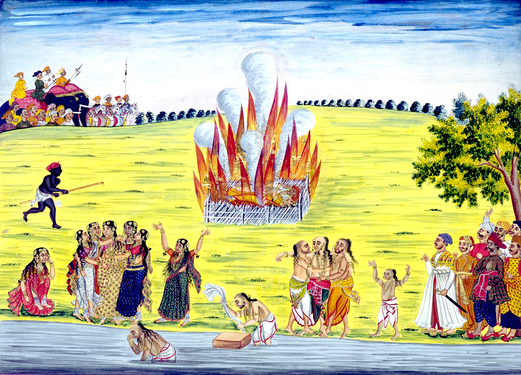 Pintura (ca. 1800) de una ceremonia Sati de la India, en la cual una viuda se quema en una pira con el cadáver de su marido. La práctica está abolida legalmente pero se sigue practicando de forma clandestina. Autor: Desconocido. Fuente: Wikipedia.