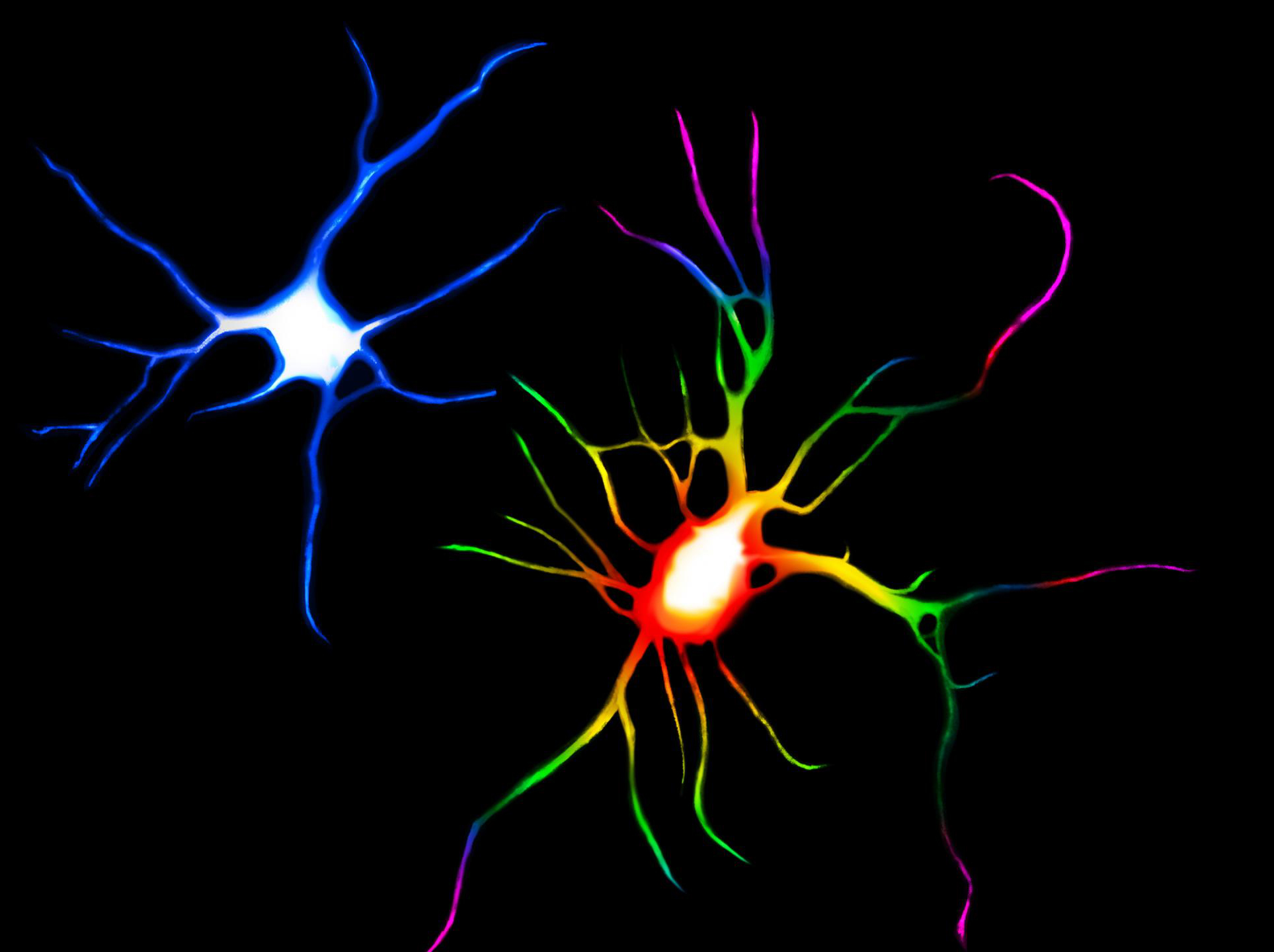 Las drogas psicodélicas podrían ayudar a "reconectar" el cerebro para tratar la depresión y otros trastornos. En esta imagen de falso color, la celda de color arco iris fue tratada con LSD en comparación con una celda de control en azul. Ilustración de Calvin y Joanne Ly, UC Davis.
