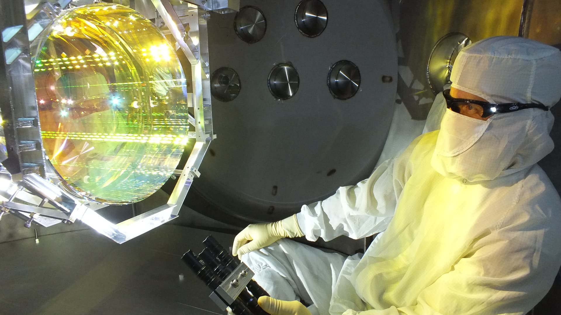 En la foto, un técnico de óptica de LIGO inspecciona uno de los espejos de LIGO. Crédito: Matt Heintze /Caltech/MIT/LIGO Lab