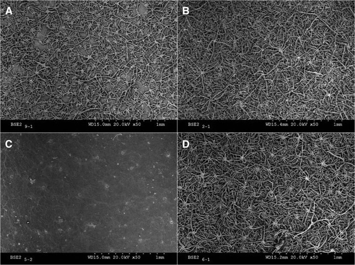 Fotos de microscopía electrónica de barrido de la superficie intacta del haz y el envés de hojas de encina. a) Haz y b) envés de una hoja joven en desarrollo. c) Haz y d) envés de una hoja adulta. Fuente: UPM.