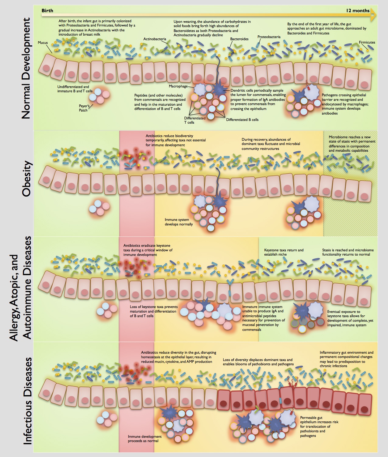 Los desequilibrios en los microbios intestinales, llamados disbiosis, se han relacionado con enfermedades infecciosas, alergias y otros trastornos autoinmunes, e incluso con la obesidad, a posteriori en la vida.