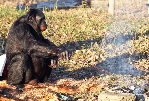 El bonobo (chimpancé pigmeo) Kanzi cocina un malvavisco en una reserva. Imagen: Laurentiu Garofeanu. Fuente: Barcroft USA