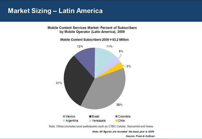 El mercado de contenidos móviles, distribuido por operadores de telefonía móvil rondó los 2.400 millones de dólares en Latinoamérica en 2009 y actualmente cuenta con unos 63 millones de usuarios en toda la región. Así se pone de manifiesto en un estudio elaborado por la compañía Frost&Sullivan, del que ha emitido un comunicado. Los países con mayor número de beneficiarios son México y Brasil, con un 38 por ciento y un 31 por ciento, respectivamente, del total del mercado.
