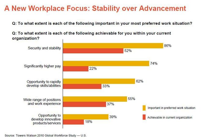 Según revela este estudio, actualmente los empleados prefieren la seguridad y la estabilidad por encima de todo lo demás, así esto signifique sacrificar el crecimiento y el desarrollo profesional, y la satisfacción laboral. A las empresas que esperaban la guerra por el talento, Towers Watson les aconseja prepararse para tener a sus empleados dentro de ellas por una década o más.