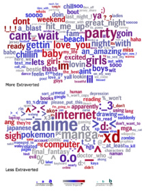 Para visualizar los resultados, los investigadores crearon nubes de palabras asociadas con un rasgo de personalidad, de mayor tamaño a medida que son más determinantes. Así, una nube que muestra el lenguaje utilizado por extrovertidos incluye expresiones como ‘fiesta’, ‘gran noche’ y ‘chute’, mientras una sobre introvertidos contiene referencias a redes, avatares y emoticonos a la japonesa, donde prima más el anonimato en la vida virtual.