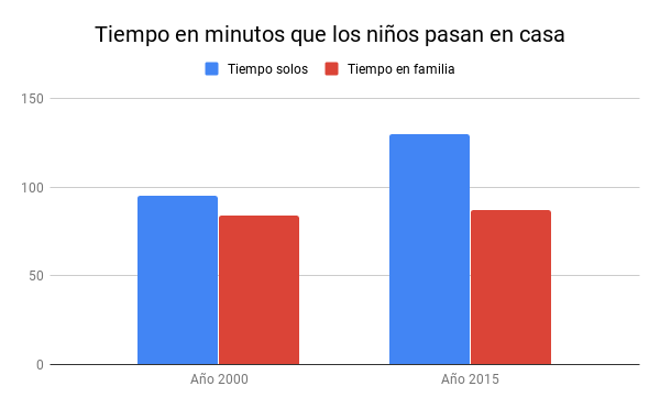 Desde el año 2000 hasta 2015, la media de minutos que los niños pasaban en casa aumentó de 347 a 379 (poco más de media hora). El tiempo dedicado a las actividades compartidas se mantuvo más o menos igual, y solo aumentó el tiempo de estar solos.