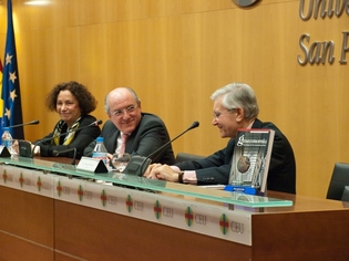 Eduardo Olier (dcha.) junto a Carlos Romero, presidente del CEU, y Ana Palacio, ex ministra Asuntos Exteriores, en la presentación del libro en Madrid.