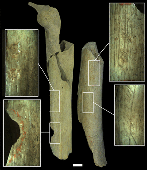 El fémur de la izquierda muestra hoyos y muescas causados por golpes, y el de la derecha muestra arañazos. Escala: 1 cm. Fuente: Real Instituto Belga de Ciencias Naturales.