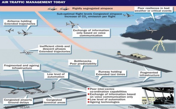 El sistema de Cielo Único Europeo comenzará a implantarse a finales de año y cambiará la gestión del tráfico aéreo de manera considerable. Pero la coordinación del sistema está generando problemas laborales y de ineficiencia, según se ha puesto de manifiesto en la reciente Conferencia Globat ATC. Por un lado existe descontento por la financiación de SESAR y, por otro, la reforma de la gestión del tráfico aéreo europeo ha traído consigo conflictos laborales, como lo muestran los ejemplos de España y Francia. El reto es triple: por un lado implementar el sistema a nivel tecnológico; por otro conseguir que los políticos se comprometan con el cambio; y finalmente aumentar el diálogo social para minimizar los conflictos.