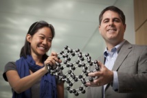 David Muller (derecha) y su colaboradora Pinshane Huang, con un modelo de la estructura atómica del cristal. Fuente: Universidad de Cornell.