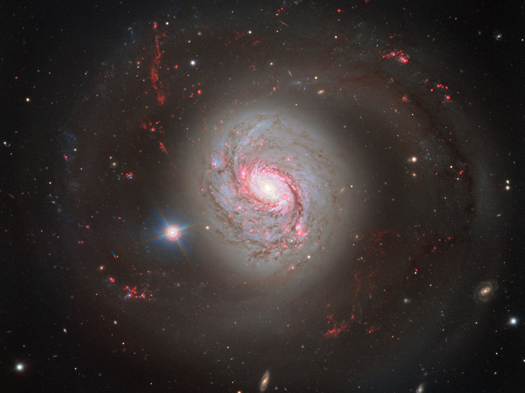 También vemos, en primer plano, una estrella de la Vía Láctea junto al centro de la galaxia, mostrando delatores picos de difracción. Además, pueden verse muchas más galaxias que, en las afueras de los brazos espirales, parecen pequeñas y delicadas en comparación con la colosal galaxia activa.