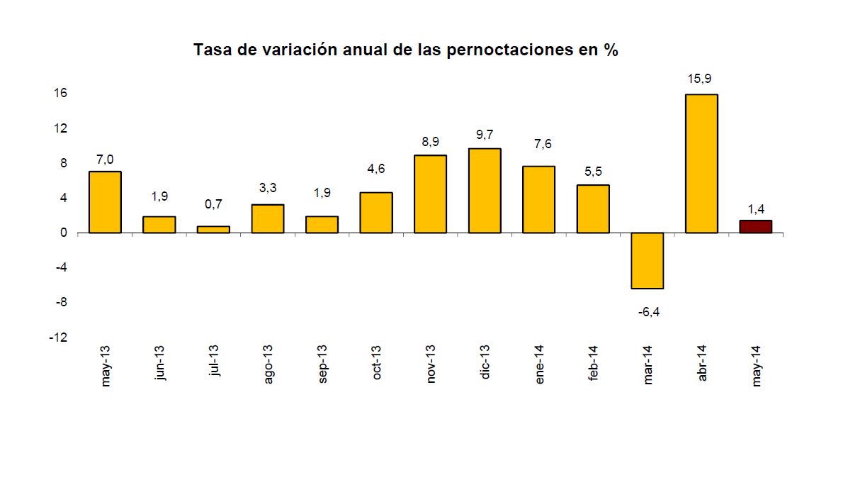 Durante el mes de mayo se registraron 26,7 millones de pernoctaciones en establecimientos hoteleros, un 1,4% más que en el mismo mes de 2013. Las pernoctaciones de viajeros residentes en España aumentaron a su vez un 4,0% y las de los no residentes un 0,2%.