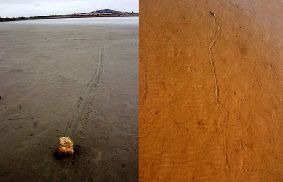 Un equipo de geólogos de la Universidad Complutense de Madrid (UCM) ha descubierto que en el fondo seco de la laguna del Altillo Chica (en Lillo, Toledo) también aparecen piedras errantes de hasta 7 kg de peso, que además dejan trazas similares a las de Racetrack Playa y pueden superar los 100 metros de longitud.