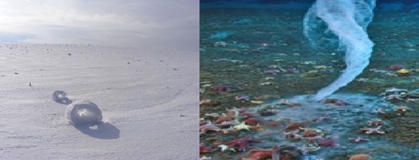 Los primeros consisten en estalactitas de hielo… que se forman en el fondo del mar. Aparecen cuando un chorro de agua muy fría se congela. Se conocen desde los años 60 del siglo XX, y el oceanógrafo norteamericano Seelye Martin los explicó en 1974. LA formación de un brinicle fue filmada por vez primera en 2011, para la serie Frozen Planet de la BBC.