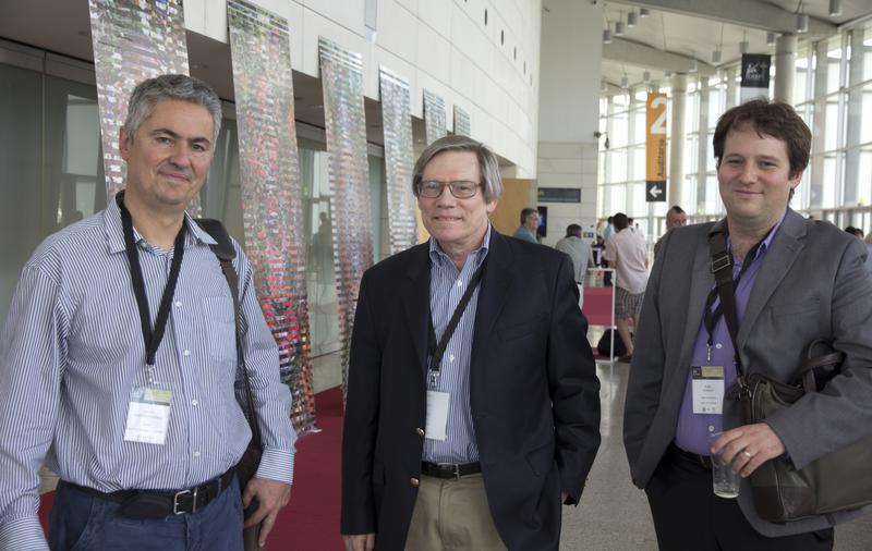Alan Guth; Roger O'Brient, de BICEP; y Enrique Martínez, de Planck, juntos en el ICHEP2014 en Valencia. Imagen: Antonio Calvo Roy.