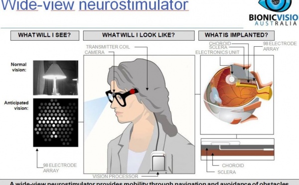 Un equipo de investigadores de un consorcio formado por varios centros de investigación australianos ha realizado con éxito el primer implante de un prototipo inicial de ojo biónico, que cuenta con 24 electrodos. El implante fue realizado a una mujer de 54 años que había perdido la visión porque padece retinitis pigmentaria. Con su nuevo ojo biónico, la paciente ya puede ver destellos y formas.