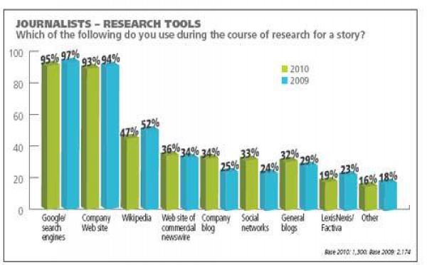 La forma de trabajar de los periodistas está cambiando notoriamente; la reciente "2010 PRWeek/PR Newswire Media Survey" reveló que hay importantes incrementos en el uso de las redes sociales por parte de periodistas con respecto al año pasado. Factores como una mayor carga laboral, tiempos de entrega más cortos y una fuerte competencia les han llevado a hacer un mayor uso de las oportunidades que ofrece la tendencia social de Internet: el 37% de los periodistas tradicionales participa en Twitter; el 39% manifiesta escribir para algún blog como parte de sus deberes profesionales; el 46% asegura utilizar los blogs para investigar; entre otros datos reveladores.