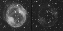Comparación de la imagen de la nebulosa obtenida a través del filtro rojo R tal cual (izda.), con la misma imagen después de restarle la imagen tomada con el filtro de banda estrecha H-alfa (dcha.). Fuente: Fundación Descubre.